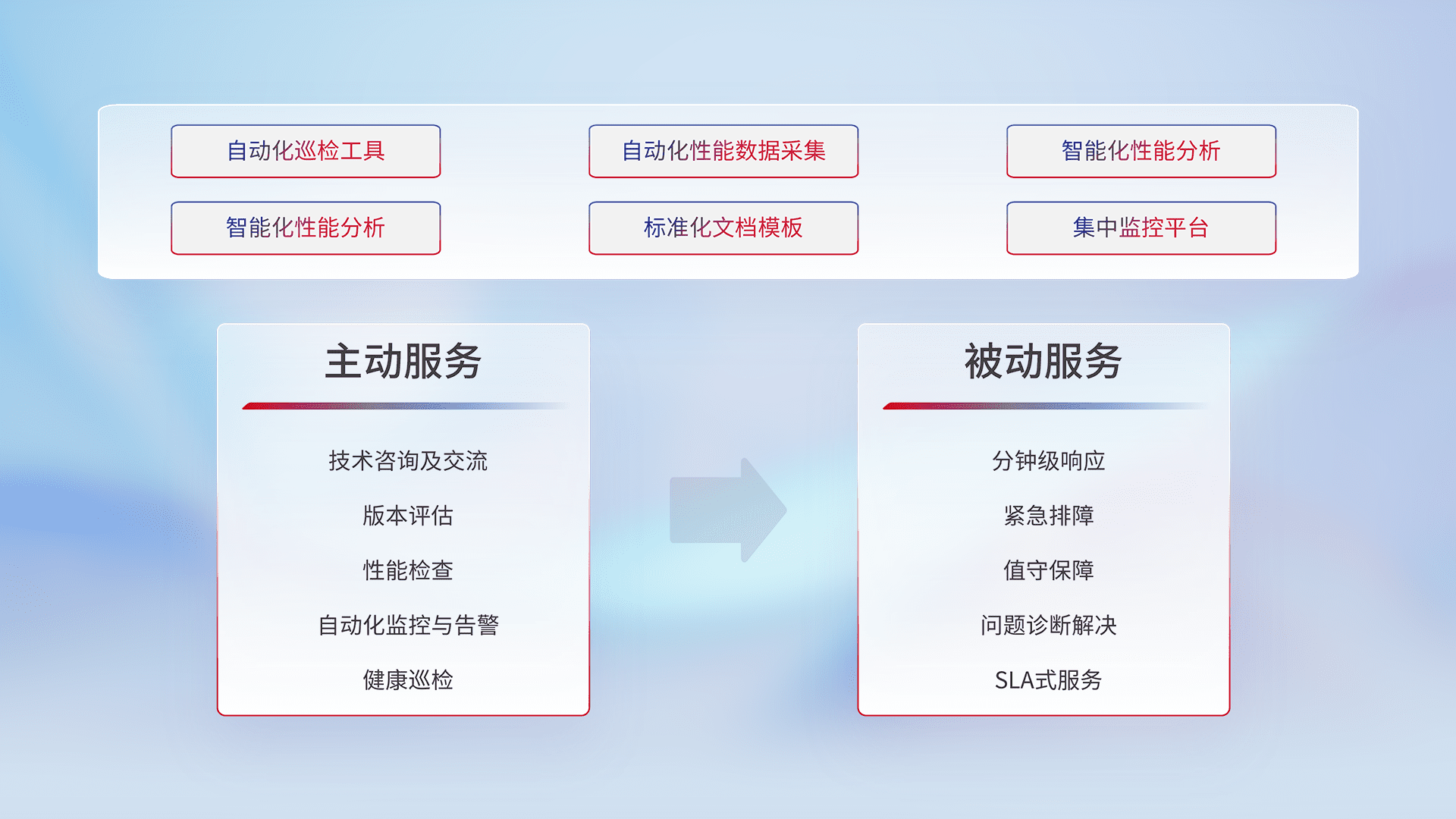 智能化工具和标准化文档,,保障服务质量,,,,提供主动服务(包含技术咨询、、版本评估、、、、性能检查、、、自动化监控与告警、、、、健康巡检)和被动服务包含(分钟级响应、、紧急排障、、、值守保障、、、问题诊断解决、、SLA服务)。。