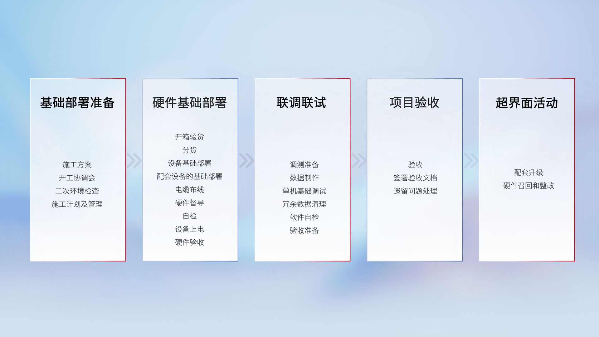 从基础部署准备、、硬件基础部署、、、联调联试、、、、项目验收、、越界面活动的全过程可追溯,,,,保证施工质量和进度。。。